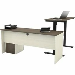 Promo 🤩 Office Desks Bestar® Prestige+ L-Station And 1 Pedestal In White Chocolate & Antigua 🔥