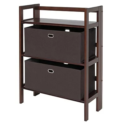This 2-Tier Foldable Shelf is made of Solid Wood and finished in Walnut. The color-complementing foldable baskets are constructed of sturdy fiberboard with Chocolate fabric. Carrying them is easy and secure with metal ring handles. Two units can be stacked to provide additional vertical storage space.