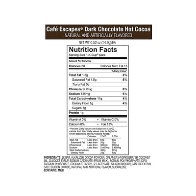 Each K-Cup includes total fat (2.5gram), saturated fat (2.5gram), sodium (180mg), total carbohydrate (9gram), sugars (7gram), and protein (1gram)