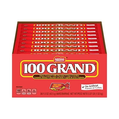 Keep the candy supply in the office, break room, classroom or cupboard fully stocked with this box of chocolate bars. Each of these bars come individually wrapped to preserve freshness and allow for easy grabbing. This 36-bar box of 100 Grand chocolate bars is a perfect way to provide a sweet treat or snack to anyone in the office.