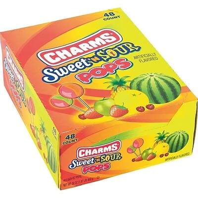 Charms Sweet and sour pop comes in assorted sour fruit flavor for added taste. Gluten and peanut free lollipop is individually wrapped, sold as 48 per box.