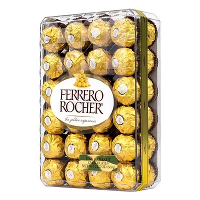 Smooth chocolaty cream surrounding a whole hazelnut within a delicate, crisp wafer all enveloped in milk chocolate and finely chopped hazelnuts. This 48-piece Ferrero Rocher box is perfect for gifting, sharing, or indulging on your own!