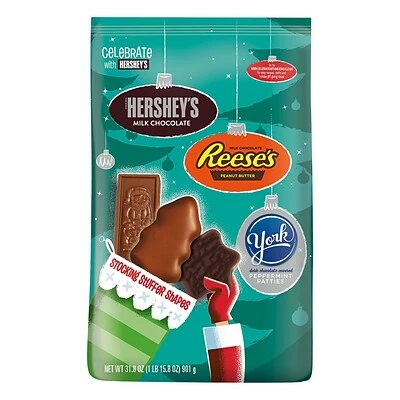 This assortment of chocolate treats in special holiday shapes is great for stuffing stockings, goodie bags and candy dishes. The bag includes everyone’s favorites – Hershey’s milk chocolates in Santa shapes, Reese’s peanut butter cups in tree shapes and York peppermint patties in snowflake shapes.