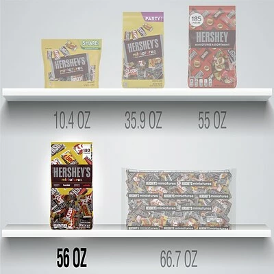 Treat guests with a candy dish full of delicious Hershey’s miniatures assortment. Each 56-ounce bag of Hershey’s miniatures assortment contains 180 individually wrapped chocolate sweets to satisfy whatever craving strikes.