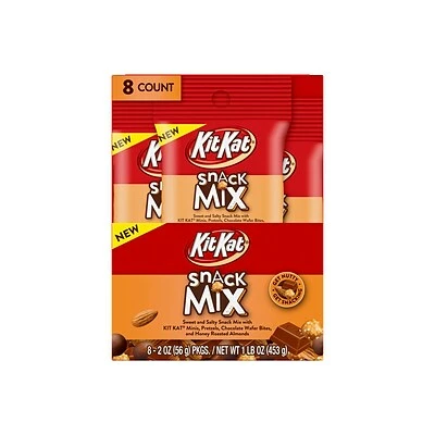 Take a snack break with KIT KAT Snack Mix. The satisfying mix of KIT KAT Minis, chocolate wafer bites, roasted almonds and salted pretzels is salty, chocolatey, crunchy and delicious. These 2-ounce tubes pouches are perfectly travel sized, which means you can take a break wherever you go.