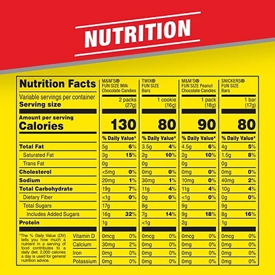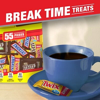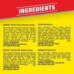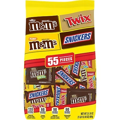 Contains one (1) 31.18-ounce, 55-piece bag of Fun Size M&M’S Milk Chocolate Candy, Peanut M&M’S Candy, TWIX Candy and SNICKERS Chocolate Bars