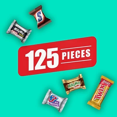 Contains one (1) 35.24 ounce, 125-piece variety bag of Minis Size chocolate candy bars