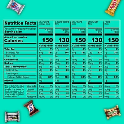 Features SNICKERS Candy Bars, TWIX Caramel Cookie Bars, MILKY WAY Caramel Chocolate Bars, MILKY WAY Midnight Dark Chocolate Candy Bars, and 3 MUSKETEERS Chocolate Candy Bars