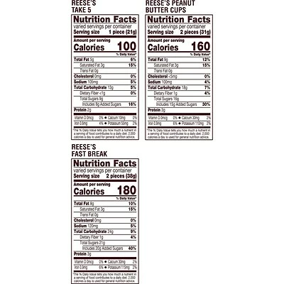 Contains one (1) 32.06-ounce bulk party pack of REESE’S Milk Chocolate Peanut Butter Assortment Snack Size Candy including REESE’S Milk Chocolate Peanut Butter Cups, REESE’S TAKE 5 Candy Bars and REESE’S FAST BREAK Candy Bars