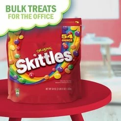 Share the rainbow when you stock up on a party size bag of Skittles original fruity candy. Every bag of Skittles candy is filled with fruity flavor, including strawberry, orange, grape, lemon, and green apple. Each bag comes packed with enough candy to share with friends, family, or coworkers. Stock the office pantry with a candy treat that everyone will love. Taste the rainbow.