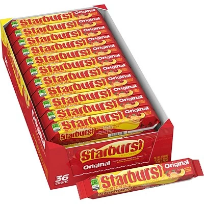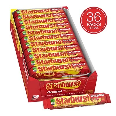 Experience the extraordinary juiciness of STARBURST Fruit Chews. With 36 singles size packs of STARBURST Original Candy in every box, there’s plenty of fruity, chewy fun for everyone. Featuring the original STARBURST Candy flavors that started it all: strawberry, cherry, orange and lemon flavors. This bulk candy package is great for stocking concession stands, vending machines or the office pantry. From Starburst candies right out of the wrapper to Starburst recipes and decorations, there are endless ways to add a burst of juicy flavor every day.