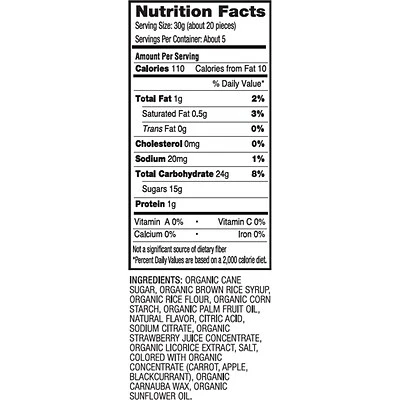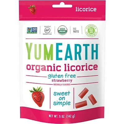 YumEarth Organic Gluten Free Strawberry Licorice isnโt just good, itโs berry good. This delicious flavor is a smash hit with strawberry lovers all with simple ingredients that are USDA Organic, Gluten Free, Non-GMO Project Verified, Vegan, Nut Free and Dairy Free. Available in a 5 ounce resealable bag, you can eat them yourself or share with a friend!