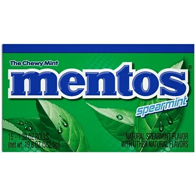 A 24 count pack of Mentos Chewy Mints in refreshing Spearmint flavor