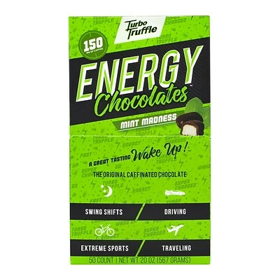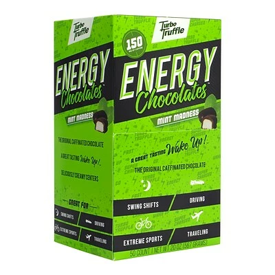 A 50-Piece box of Turbo Truffles Energy Chocolate Mint Madness flavor