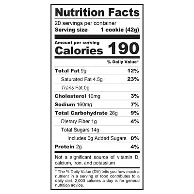 To cook: Preheat oven to 325, place frozen cookies on sheet pan, bake 10-12 minutes, loosen cookies with spatula after 5 minutes, and allow to cool completely before enjoying