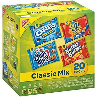 The Nabisco 20 oz classic mix lunch variety snack pack is an excellent traveling snack or lunch-box solution. It contains Oreo chocolate sandwich cookies, Ritz Bitz crackers, mini chips Annoy! Real chocolate chip cookies and nutter butter bites sandwich cookies. It comes in single serve package, sold 20 per pack.