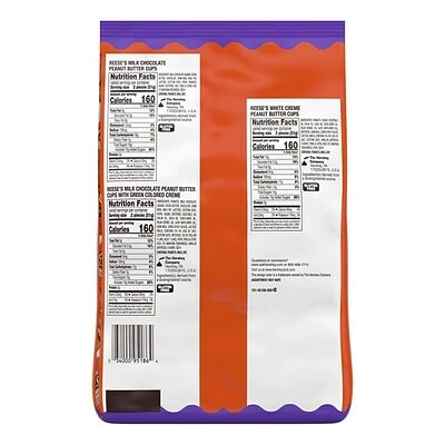 Contains one (1) 41.25-ounce, 75-piece bulk variety bag of REESE’S Halloween Lovers Milk Chocolate and White Creme Assortment Snack Size Cups Candy