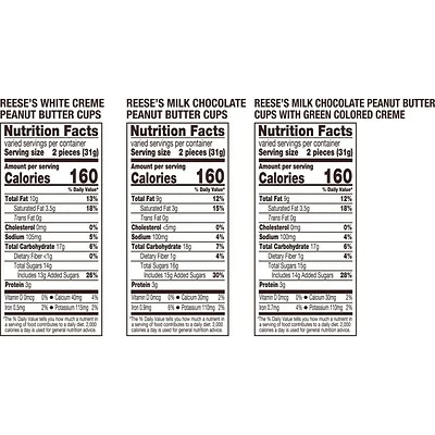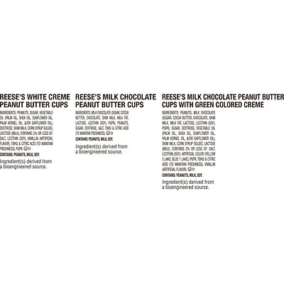 Includes REESE’S milk chocolate peanut butter cups, white creme peanut butter cups and Franken-Cup milk chocolate peanut butter with green colored creme cups candy