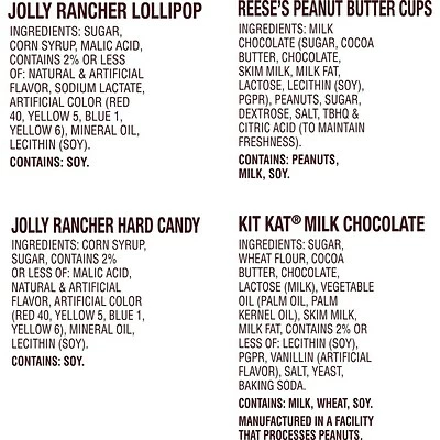 Includes REESE’S milk chocolate peanut butter cups, KIT KATยฎ milk chocolate wafer candy bars and JOLLY RANCHER fruit-flavored lollipops and hard candy