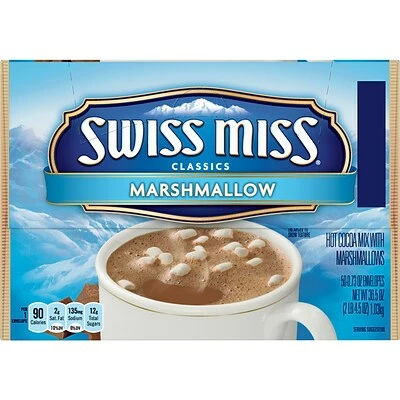 Supply delicious drinks for the reception area, staff room or other various spaces with these hot cocoa packets. Each one contains a delightful chocolaty mix and includes marshmallows, adding an extra layer of tastiness to your beverage. These Swiss Miss hot cocoa packets come with 50 to a box, making it easy to restock your supply.