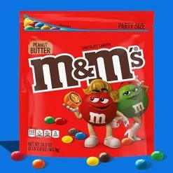 Contains one (1) 34-ounce party size resealable candy bag of M&M’S Peanut Butter Chocolate Candy Bulk Pack