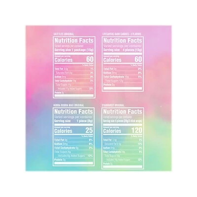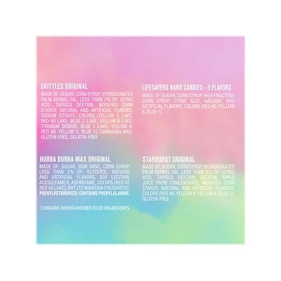 Pack includes: SKITTLES Original, STARBURST Original, LIFE SAVERS gummies, and Hubba Bubba Max bubble gum