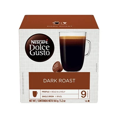 Nescafe Dolce Gusto dark roast is a bold, lively, and full-bodied cup with sweet dark chocolate notes and licorice.