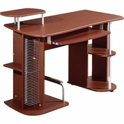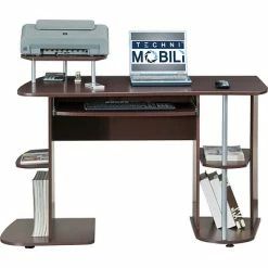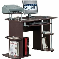 This Techni Mobili Computer Workstation Desk incorporates abundant shelving into a compact, sturdy, and stylish design. It features a slide-out keyboard panel equipped with a safety stop, an elevated desktop accessory shelf, several shelves and a CPU/storage platform. The desktop has an 80 lbs. weight capacity, the shelves all have 30 lbs. weight capacities, with the exception of the small shelf behind the media rack which can hold up to 10 lbs. The multifunctional desk is made of heavy-duty MDF panels with laminate veneer. It’s scratch-resistant powder-coated steel frame adds a nice touch to it’s elegant look. Color: Chocolate.