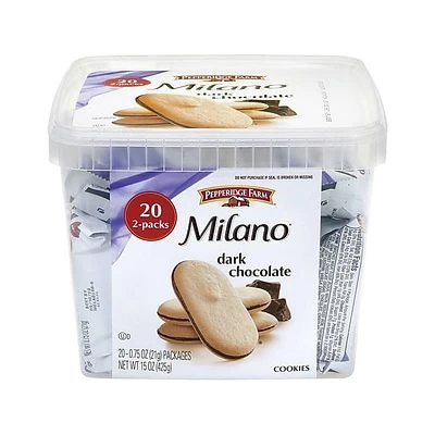 Grab a handy pack of these decadent cookies whenever you’re craving a rich snack at work. With two delicious cookies per pack, they’re just right for an afternoon pick-me-up at work or an on-the-go snack. This twenty-pack ensures there are plenty to satisfy a hungry office or home and the resealable tub keeps these Pepperidge Farm Milano dark chocolate cookies fresh in a pantry or cupboard.