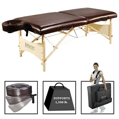 The Balboa portable massage and exercise table is everything the busy professional needs and nothing they don’t. The beautifully crafted rich brown upholstery is oil- and water-resistant, CFC-free, features a denim-like reinforcement for added durability that comes with a 5 Year Guarantee. The upholstery nicely complements the light natural hardwood legs protected by a Dura Seal finish. Setting up the table is a breeze with the no assembly required and the Shiatsu Cable Release allows the table to lay flat on the floor. Auto-Lock leg system and the numbered leg adjustment holes. Strength and stability are a key advantage of the Balboa and several additions help: the leg brace stabilizer bar, Clevis Block leg attachments, and Duo-Plane center hinges all add strength. The table’s square corners have been proven by researchers to relax shoulders more than standard tables. All wood used in the table is free of formaldehyde and carcinogens in compliance with the California Air Resources Board (CARB) law. This package includes an ErgonomicDream face cradle, memory face pillow, and a single pocket carrying case.
