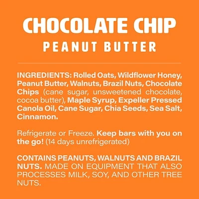 Our Chocolate Chip Peanut Butter bars are blended with fresh peanut butter, oats, walnuts, brazil nuts, chia, dark chocolate chips, and sweetened with wildflower honey and Maple syrup.