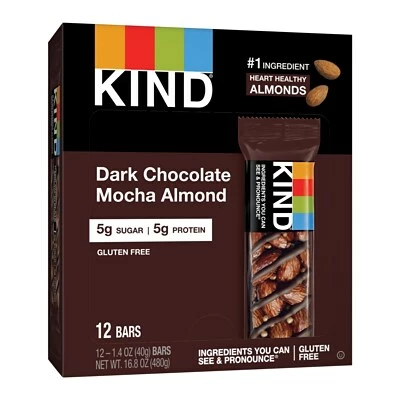 Stock up on a snack that is low in sugar and high in fiber with this 12-pack of dark chocolate mocha bars. With only five grams of sugar and five grams of protein, these KIND dark chocolate bars make a healthy snack anytime, anywhere.