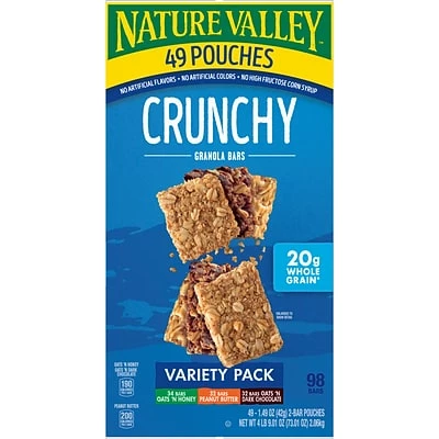 Enjoy the sweetened granola in this crunchy variety pack. This assortment has three flavors to satisfy cravings, and they come in individually wrapped 2-packs for precise portioning. This Nature Valley granola bar variety pack has 98 bars to ensure less frequent stocking is necessary.