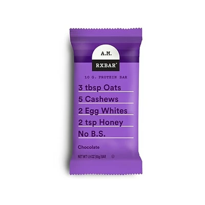 What’s the best way to add chocolate to your morning routine and still feel good about it? Just add the RX Bar A.M. chocolate protein bar. Each breakfast protein bar is made with simple ingredients such as smooth chocolate, soft-rolled oats, cashew butter, and pumpkin seeds. You’ll love the soft yet crispy texture, loaded with ingredients that pair perfectly with your morning cup of joe. Plus, 10g of protein (15% of your daily value) for a morning boost to start your day.