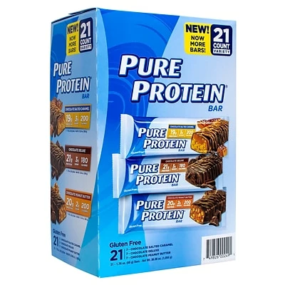 Pure Protein Bars are the perfect combination of high protein, with less than 3g of sugar and great taste This delicious Chocolate Variety Pack has up to 21g of protein for quick and sustained energy, and it is gluten free