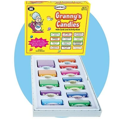 Super Duper® Granny’s Candies® Set 3 verb card game includes 672 word meaning cards of 3″ X1″ and activity book with lessons, activities and games. Set 3 is an add-on set and ideal for grades 2 to 6.
